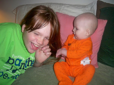 That big bundle of bows I bought for Cosy finally came this week. It was a deal on Amazon back in November where I got a whole mess of bows for $3.92. They have a pretty sturdy metal clip on them that would cut into her little head if we put them on her stretchy (not really elastic) headbands. We decided that Nana and Mama could use them. So if you are in White County and you see a curvy girl with a little bow in her hair - it's probably either me or Tasha. Pictures above are comparison of Marquee holding Cosy and then holding Ollie. Below are the two of them playing on the couch. They can both sit up to some degree or another. Cosy slid down and just kind of stayed there. Ollie was mesmerized by Cosy's toy and then by her tutu. I was about six inches away from them... they're not quite ready for us to just turn them loose on each other.