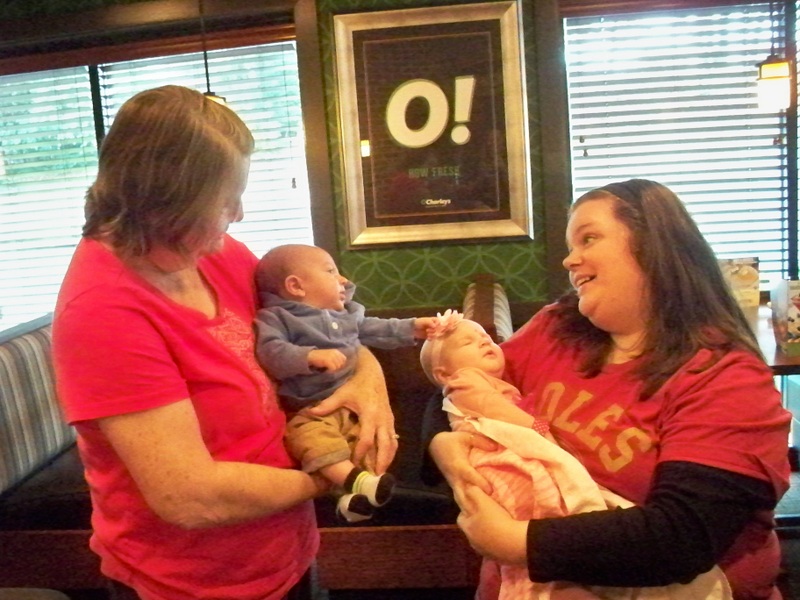 My Nana heart is content for now. It is HARD to split time evenly between babies. Part of the time Ollie was nursing... and since Austin wasn't with us I tried to hold Cosette enough that Tasha would be able to enjoy her lunch. (I barely ate a thing... brought almost the entire meal home with me!) Ollie is lighter but Cosette holds on better. I tried hard to just hold babies and not worry about the pain. I'm still paying for that! They're too young to interact much yet but they did notice each other... and... yeah. That's what happened.